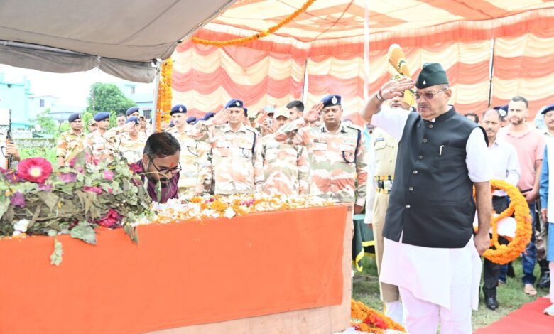डोईवाला निवासी आईटीबीपी निरीक्षक शहीद चंद्र मोहन सिंह नेगी को श्रद्धांजलि अर्पित करते सैनिक कल्याण मंत्री गणेश जोशी